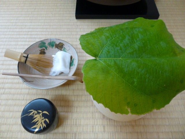 葉っぱを、水指しのふた(いつもは漆とか陶器でできている)に見立てています。
