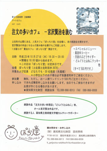 注文の多いカフェ「宮沢賢治を読む」 2011年09月23日 17:57 Tweet 高知県文化財団さんの主催で、コラボイベントをします。 10月27日「注文の多いカフェ~宮沢賢治を読む」朗読会です。 (18:00~20:00) 月夜のぽっちり堂で、お茶を飲みながら、ゆったり宮沢賢治の世界に聴きいってみませんか? この日は特別メニュー、真夜中コーヒー、月夜のぶどうサイダー、どんぐりと山猫クッキーなど登場します。 楽しみ~[E:notes] ☆参加費は無料、ワンドリンク(500円)のオーダーお願いします。 参加ご希望の方は、予約して頂けると助かります。 「講座」カテゴリの最新記事 Tweet < 前の記事次の記事 >