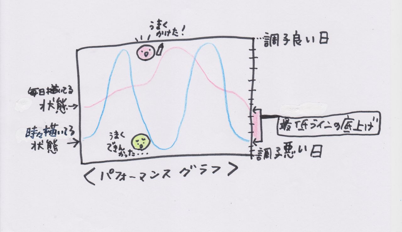 デッサンでは毎日同じように静物や人を描写するのですが、自分のコンディションによって出来の良い日も悪い日もあり、それが絵に出ます。それでも毎日描くことによって、最低コンディションの時の自分が描けるラインを少しでも上がっていく。このグラフのように・・・・↓
